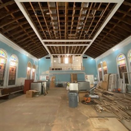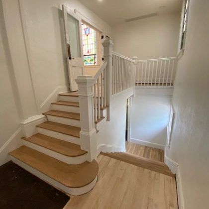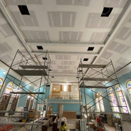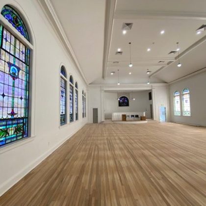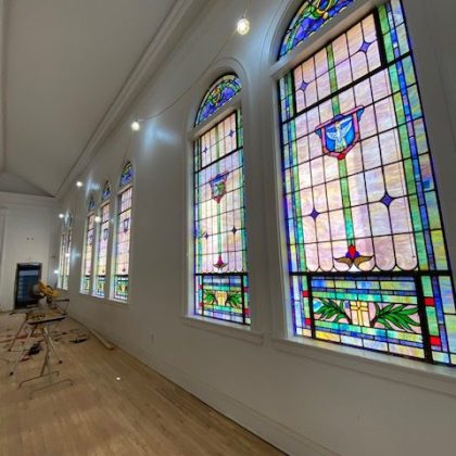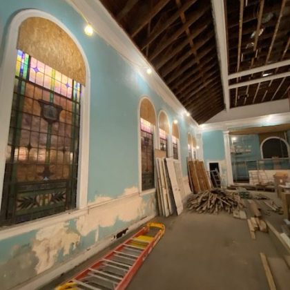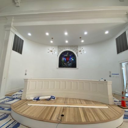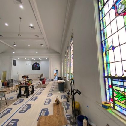 Every effort was made throughout the project to retain original details from the church or at a minimum make genre and age-appropriate modifications. While the original windows were carefully removed, steamed, and restored, we reclaimed oak wood planks from the basement floor and repurposed them for use throughout the main level. The slate roof was also updated with careful additions made to approximately a quarter of it. ACS also replaced aging electrical and plumbing systems to round out the renovation and prepare it for the demands of a new congregation. Combined with new lighting, paint and other details, the change has been profound.
