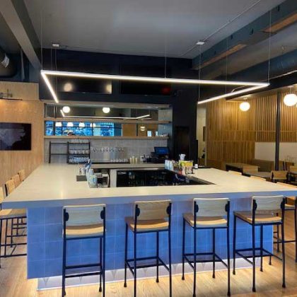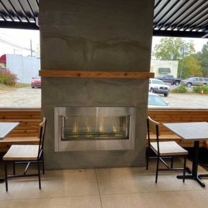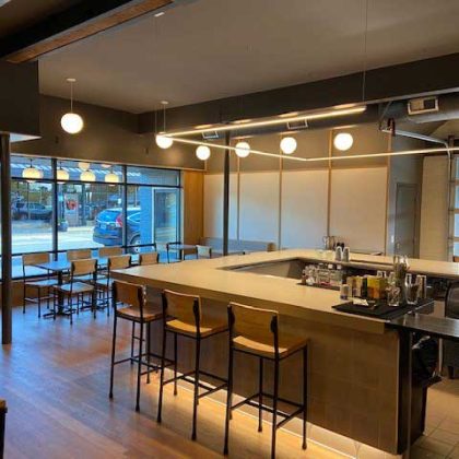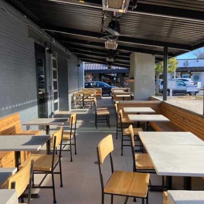 Inside, custom touches are found throughout. Leather banquette seating lines the dining room and compliments the polished floors and millwork. The central u-shaped bar anchors the interior space and a custom-built garage door on one side of the room leads to a covered, heated patio that boasts an outdoor fireplace and seating for forty-five.