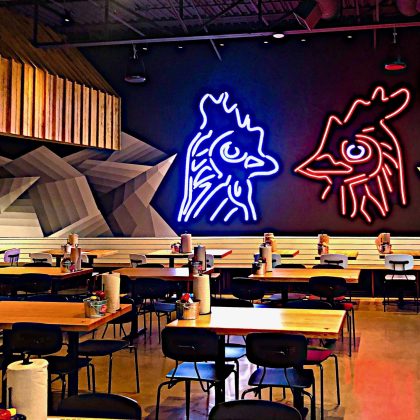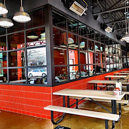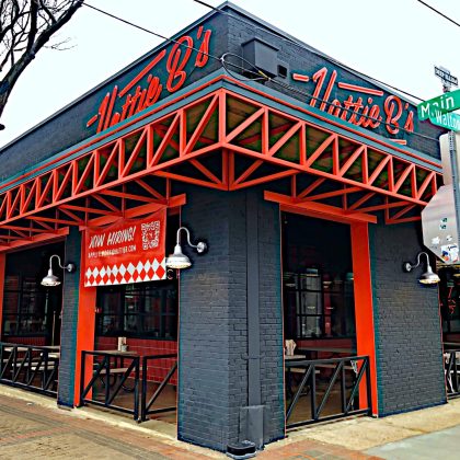 The dramatic black painted exterior, red accents, and well-placed lighting, are true to the established Hattie B’s brand designed by the creative team at Loaded for Bear. The casual indoor seating has the familiar look and feel Hattie B diners have grown accustom and the generous covered outdoor patio allows diners to enjoy the extension of the dining room at any time. The building makes quite the statement at its prime location.