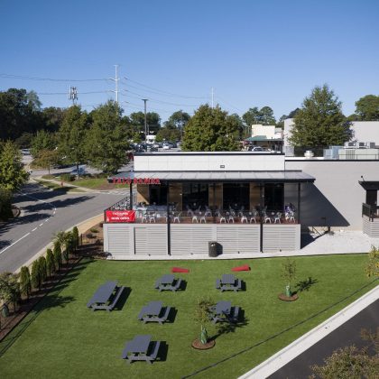 The dining concept behind Taco Bamba is an elevated taqueria. The overall aesthetic is a mixture of industrial and rustic. There are exposed ceilings and metal and steel accents contrasted with Ambrosia Maple wood elements, including a rich, custom-made bar top and steel shelving by local custom artisans, Raleigh Reclaimed. The 2,800 total square footage is broken down into an interior dining room, bar area and generous elevated outdoor deck, which is perched over an expansive green lawn. To enhance the dining experience, a transparent paneled roofing was used over the deck to allow sunlight to flood the space without allowing UV rays to penetrate.